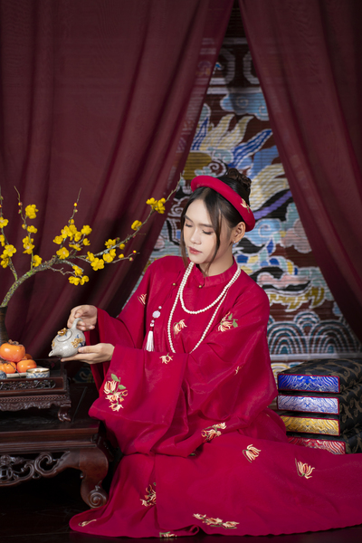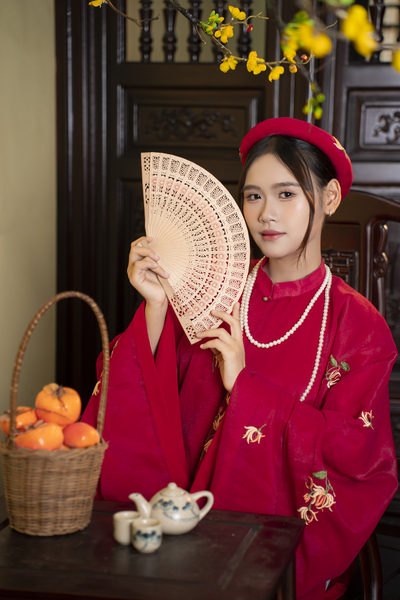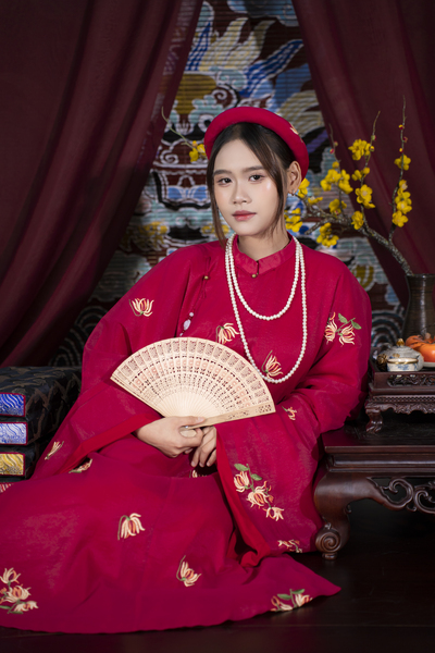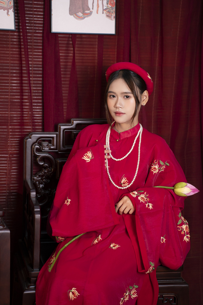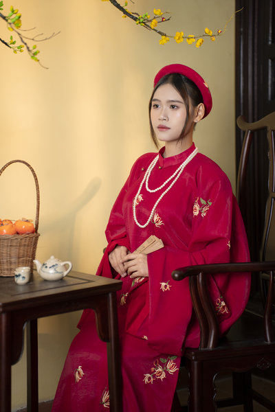 – Áo Tấc vải tơ màu đỏ thêu hoa cúc lót đỏ, sang trọng, dịu dàng