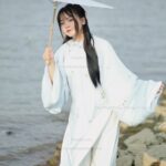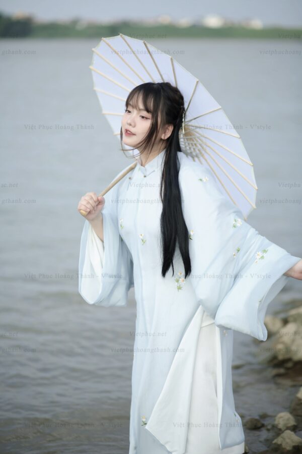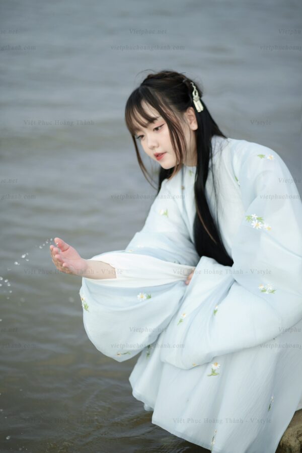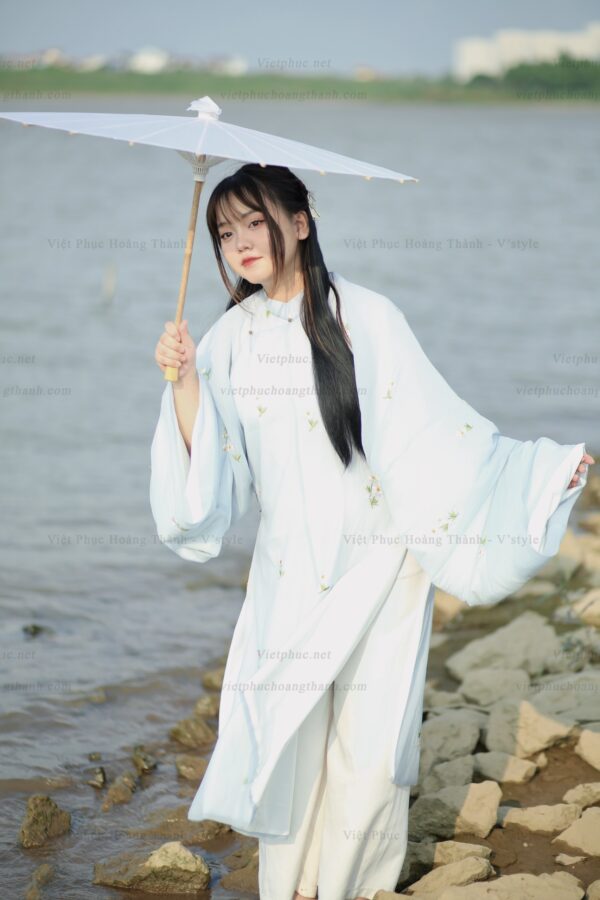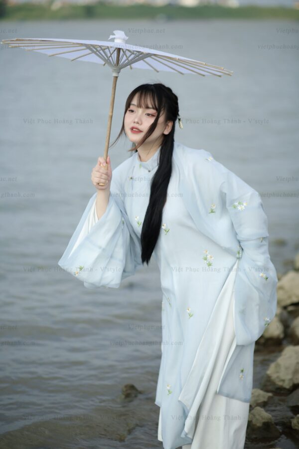 – Áo Tấc vải tơ xanh trời lót trắng thêu hoa cúc họa mi, sang trọng, dịu dàng