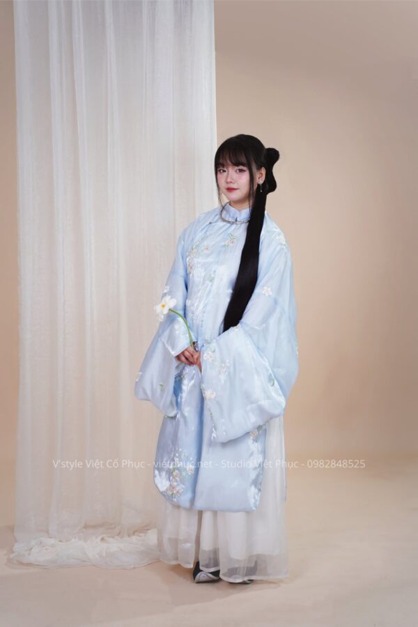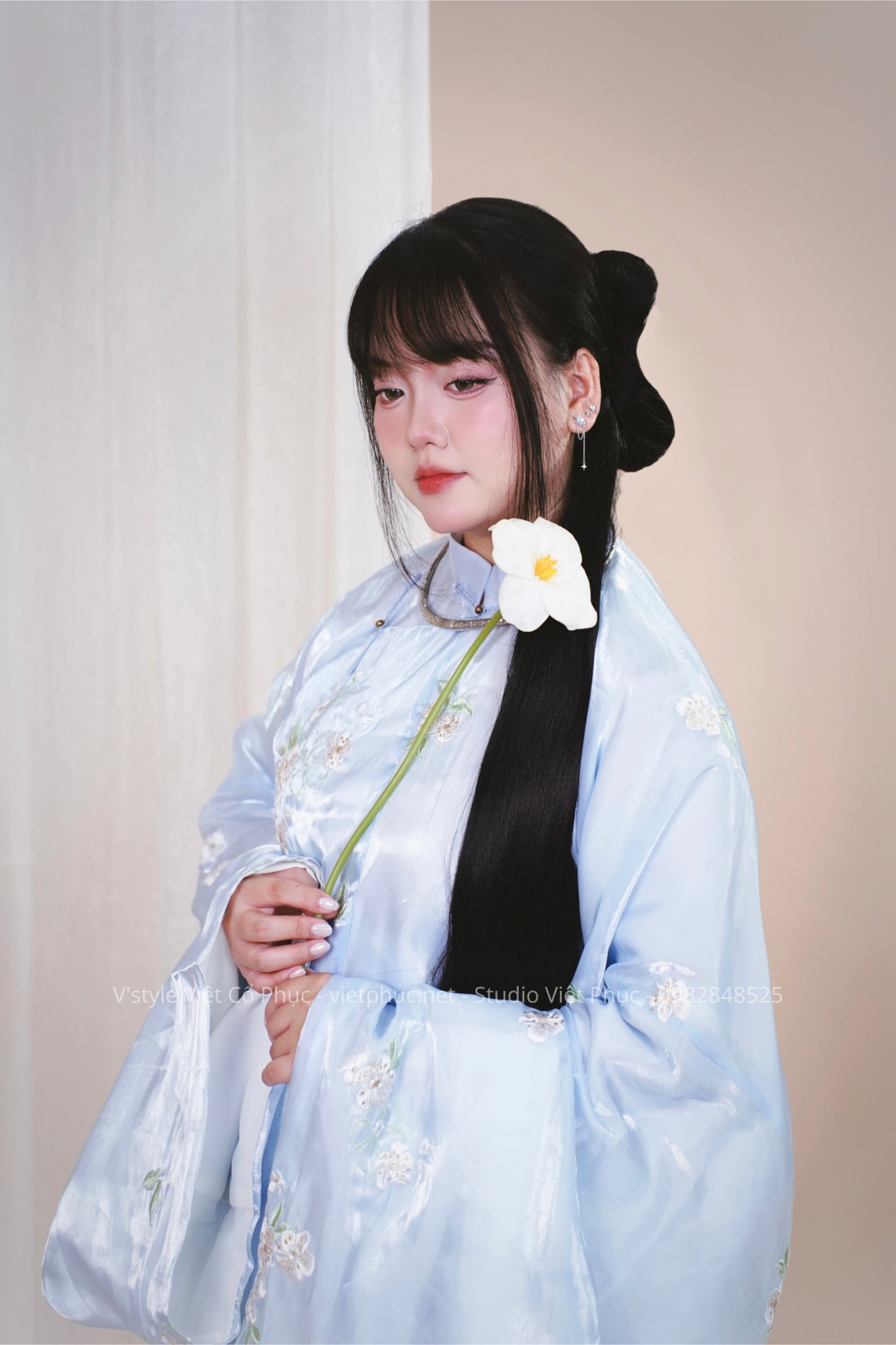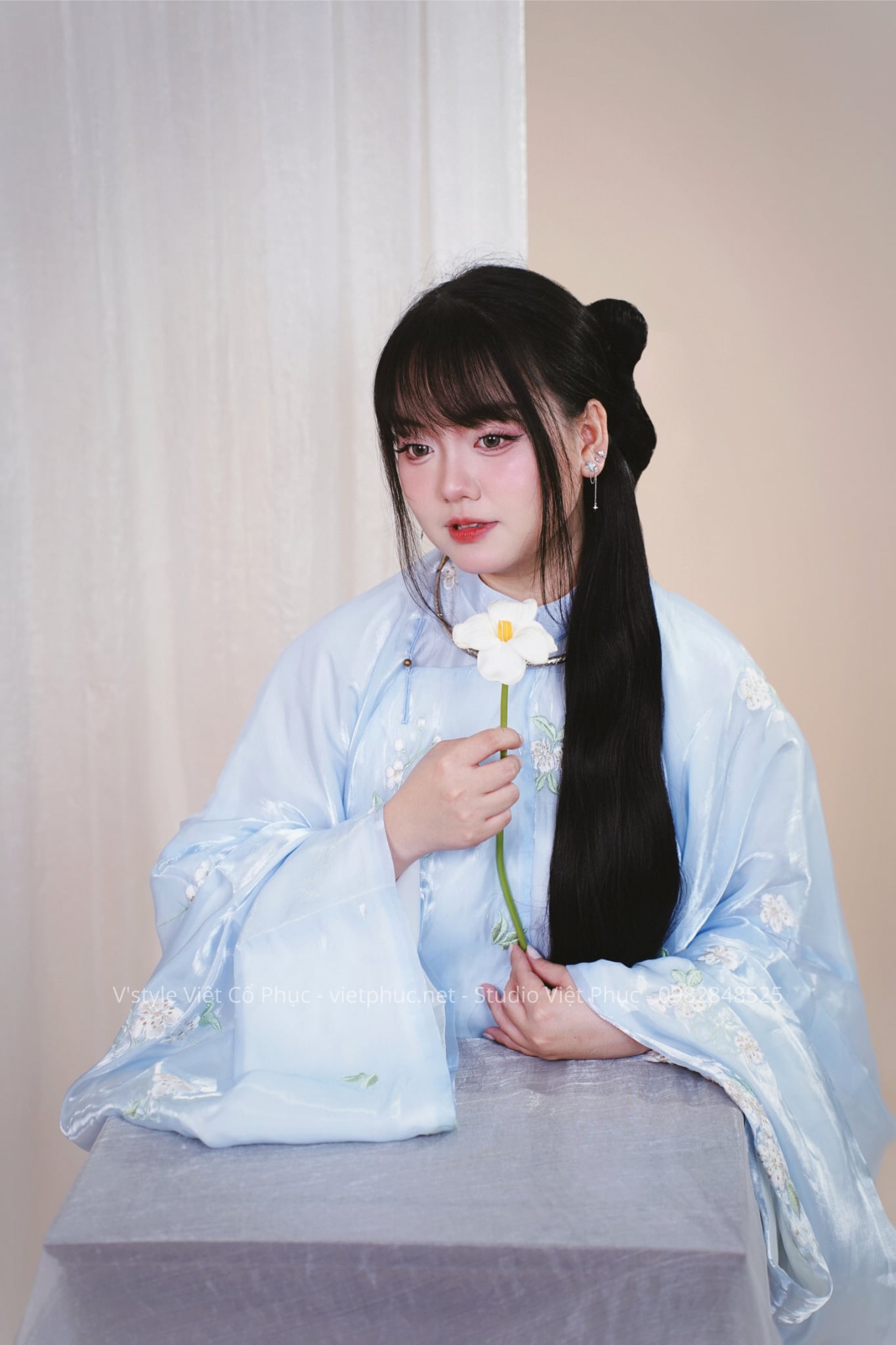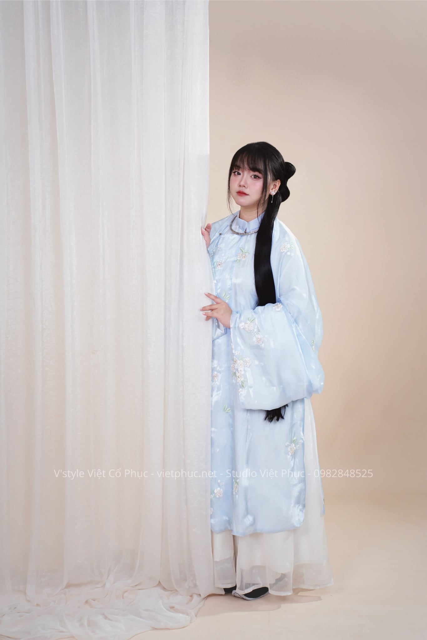 Mã thuê A184: Fullset Áo Tấc Ngọc hoa thanh mai xanh trời lót trắng (unisex)