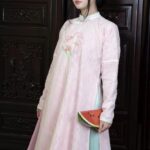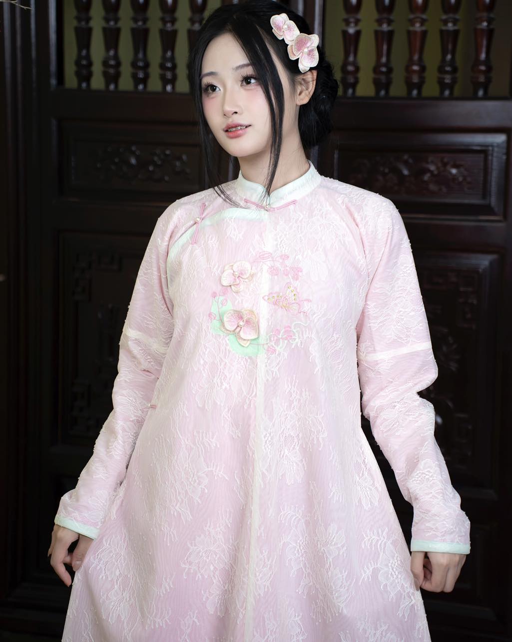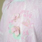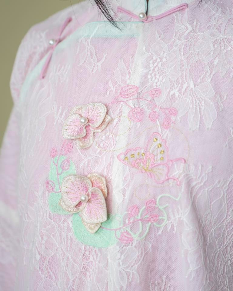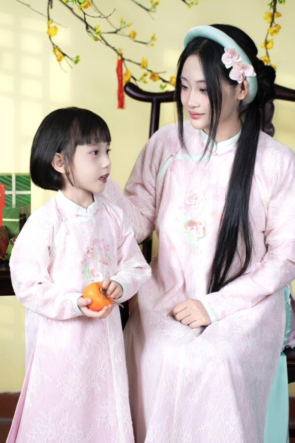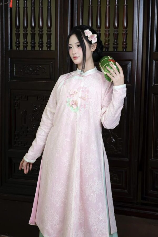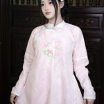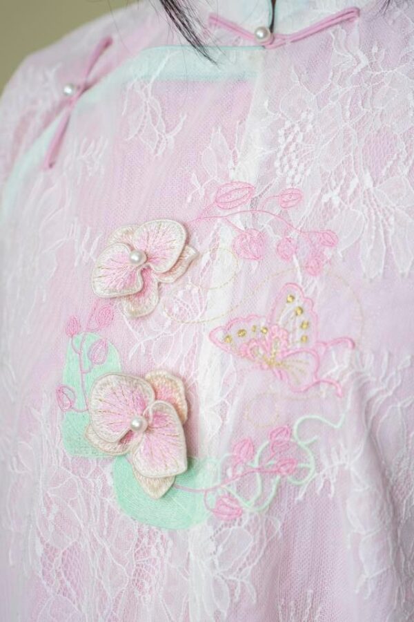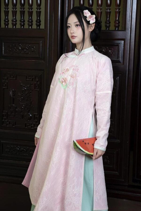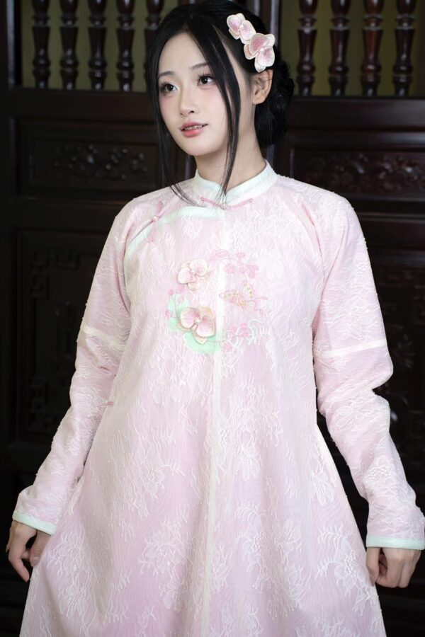 – Áo Ngũ thân tay chẽn vải tơ thêu hoa lan hồ điệp, màu hồng