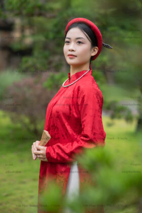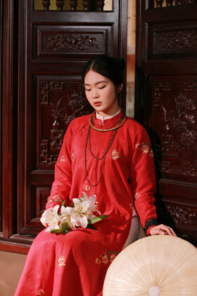 Mã thuê B100: Fullset áo Ngũ thân tay chẽn tơ đỏ thêu hoa cúc
