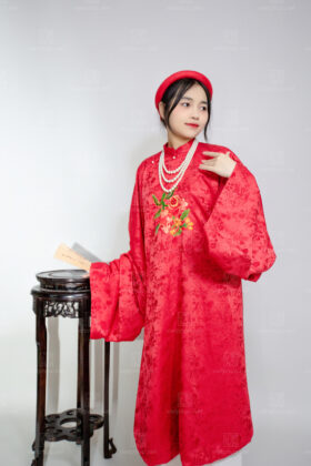 Mã thuê AT6: Fullset Áo Tấc tafta nhũ đỏ đô thêu thủ công