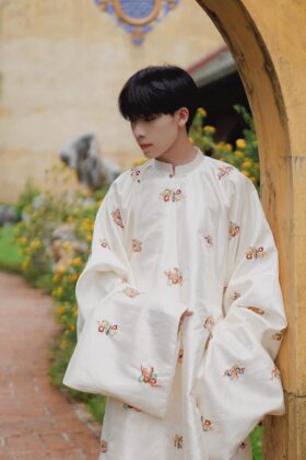 Mã thuê AT7: Fullset Áo tấc nhũ kem thêu bát bửu cho nam hoặc nữ