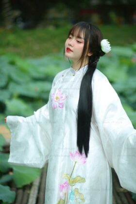 Mã thuê AT5: Fullset Áo Tấc sa hàn trắng thêu hoa Sen