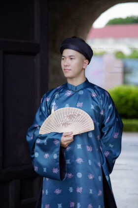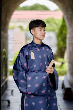 Mã thuê G12A: Fullset áo Áo tấc xanh than lót đen ép nhũ hoa văn chữ Thọ